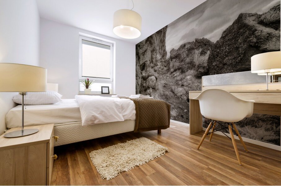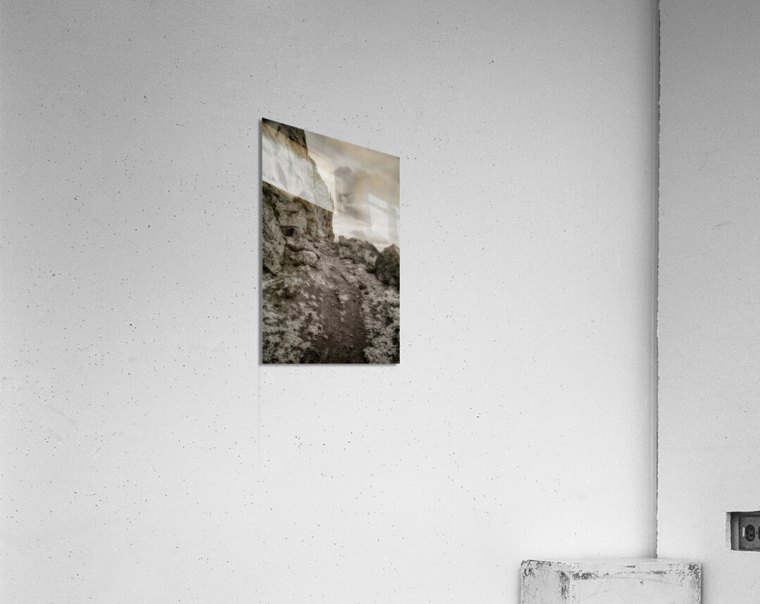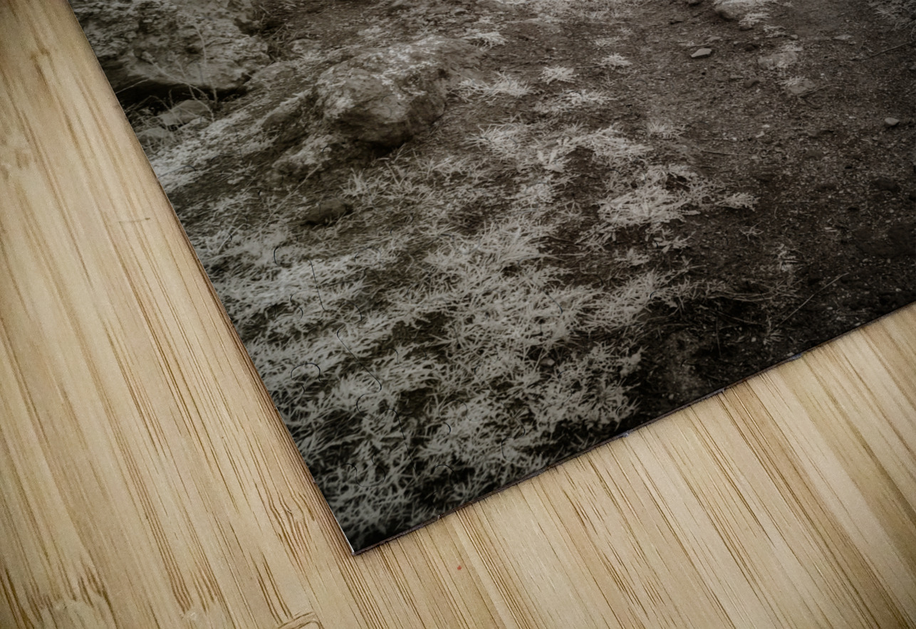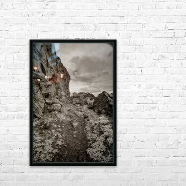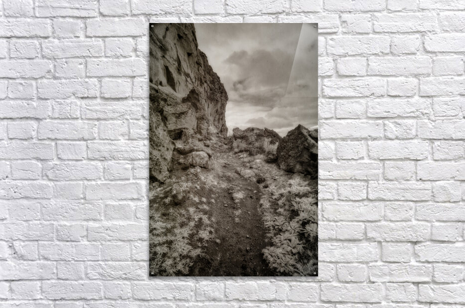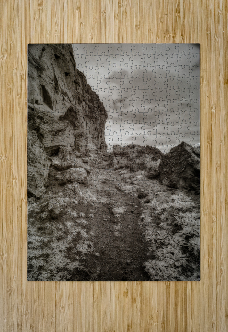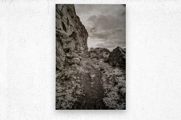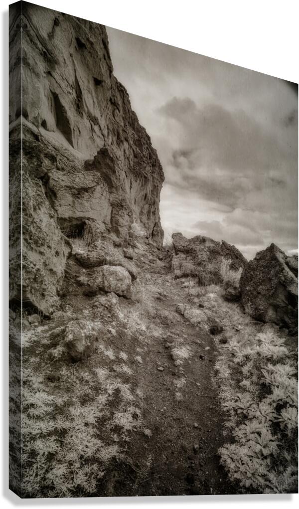 "Whispers Among the Boulder Sentinels" is an enigmatic journey captured in monochrome, where the landscape emerges as a timeless sentinel of nature’s enduring mysteries. This photograph captures a trail along Register Hill in Wyoming, a historical landmark where pioneers traveling the Oregon Trail would etch their names into the rock, leaving behind a silent testament of their journey westward. The viewer is invited into a secluded world, where a winding rocky path becomes the silent narrator of tales untold. The path meanders through a terrain fiercely guarded by monumental boulders and towering cliffs that loom defiantly on the left, creating an aura of ancient wisdom and quiet fortitude. The photograph is imbued with a sense of rugged beauty, its allure amplified by the sparse vegetation that peppers the uneven ground. This subtle greenery adds a layer of texture, as if the earth itself whispers secrets through its resilient foliage. Above, the canopy of clouds drapes the scene in a cloak of diffused light, casting soft shadows that enhance the tactile richness of the rocks and terrain below. This interplay of light and shadow draws the eye deeper into the composition, an invitation to explore its austere and beguiling landscape. There is an almost intangible pull to this imagery, a suggestion of stories etched in stone and air that beckon the observer toward unknown horizons. "Whispers Among the Boulder Sentinels" captures the raw essence of a land untouched and eternal, where each crevice and cliff holds the promise of discovery, echoing the eternal dialogue between earth and sky, and the profound journey of those who left their marks upon the stone.