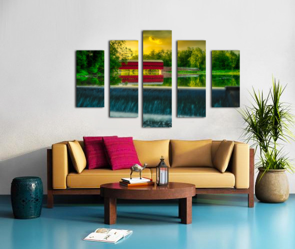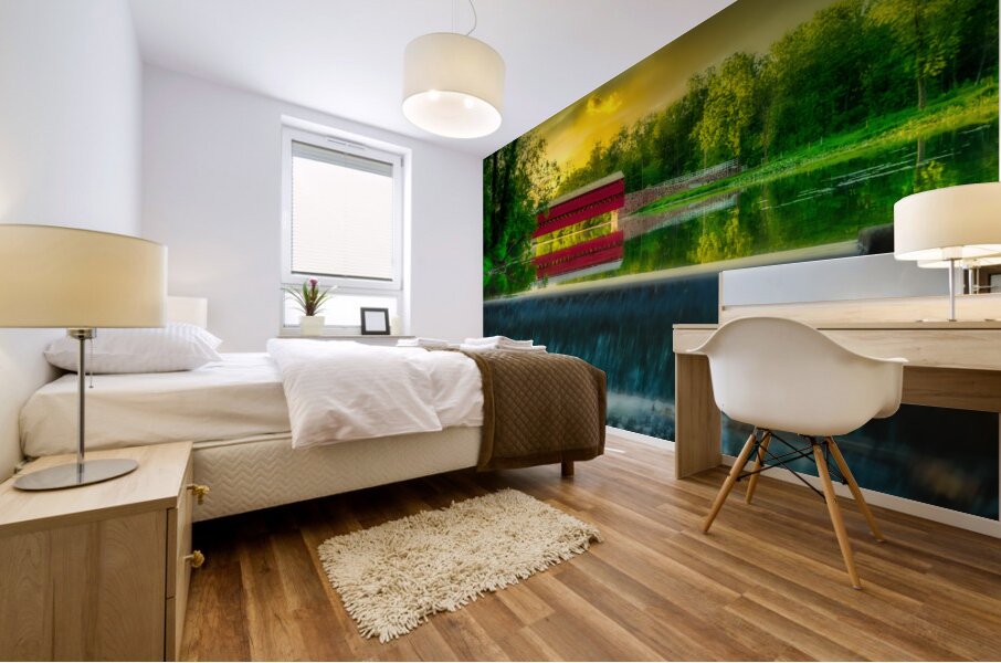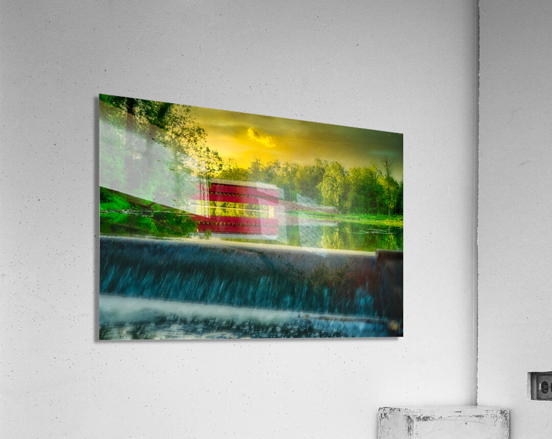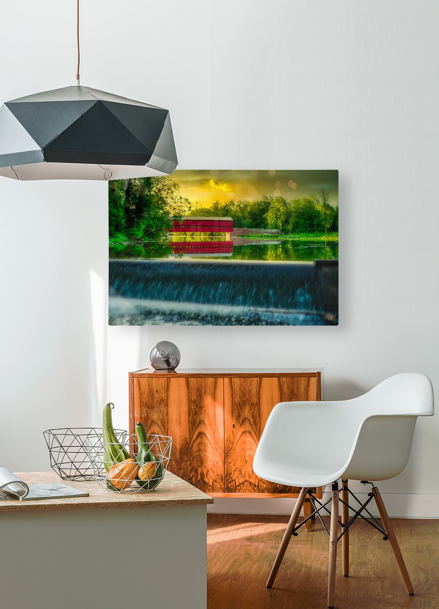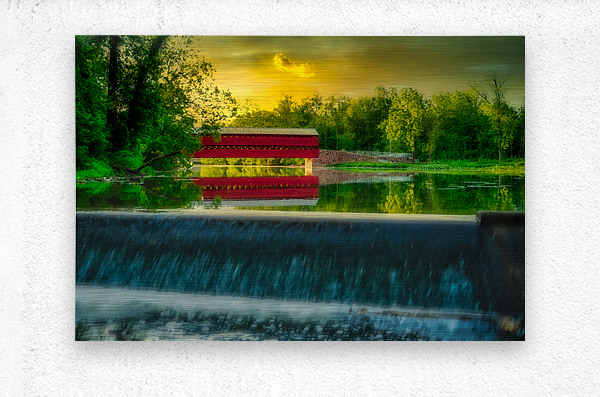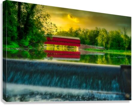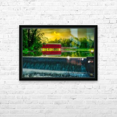 Step into a world of serene beauty and tranquility with "Tranquil Reflections," a captivating artwork that transports viewers to the idyllic Sachs Bridge in Gettysburg, Pennsylvania, bathed in the warm glow of sunset. This stunning image captures the essence of peace and serenity, inviting viewers to immerse themselves in the tranquil atmosphere of the rural setting. As the sun dips below the horizon, casting a golden hue across the landscape, Sachs Bridge stands as a majestic focal point, its charming red structure contrasting beautifully against the verdant surroundings. The gentle cascade of a nearby waterfall adds to the enchanting scene, imbuing it with a sense of timeless beauty and tranquility. Surrounded by lush greenery, Sachs Bridge exudes warmth and serenity, inviting viewers to linger and soak in the natural splendor of their surroundings. The dramatic sky, painted in orange, pink, and purple hues, serves as a stunning backdrop to the scene, enhancing its beauty and adding depth and contrast. As viewers gaze upon the breathtaking scenery before them, they are invited to pause and reflect on the beauty of nature and the timeless charm of Sachs Bridge. This captivating artwork is a reminder to slow down, appreciate the simple pleasures in life, and find solace in the tranquility of the natural world.