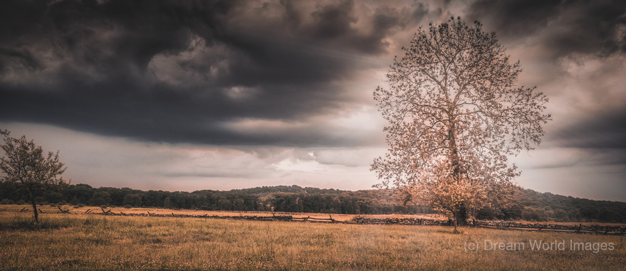A storm rolling over a lone tree in a field in Gettysburg