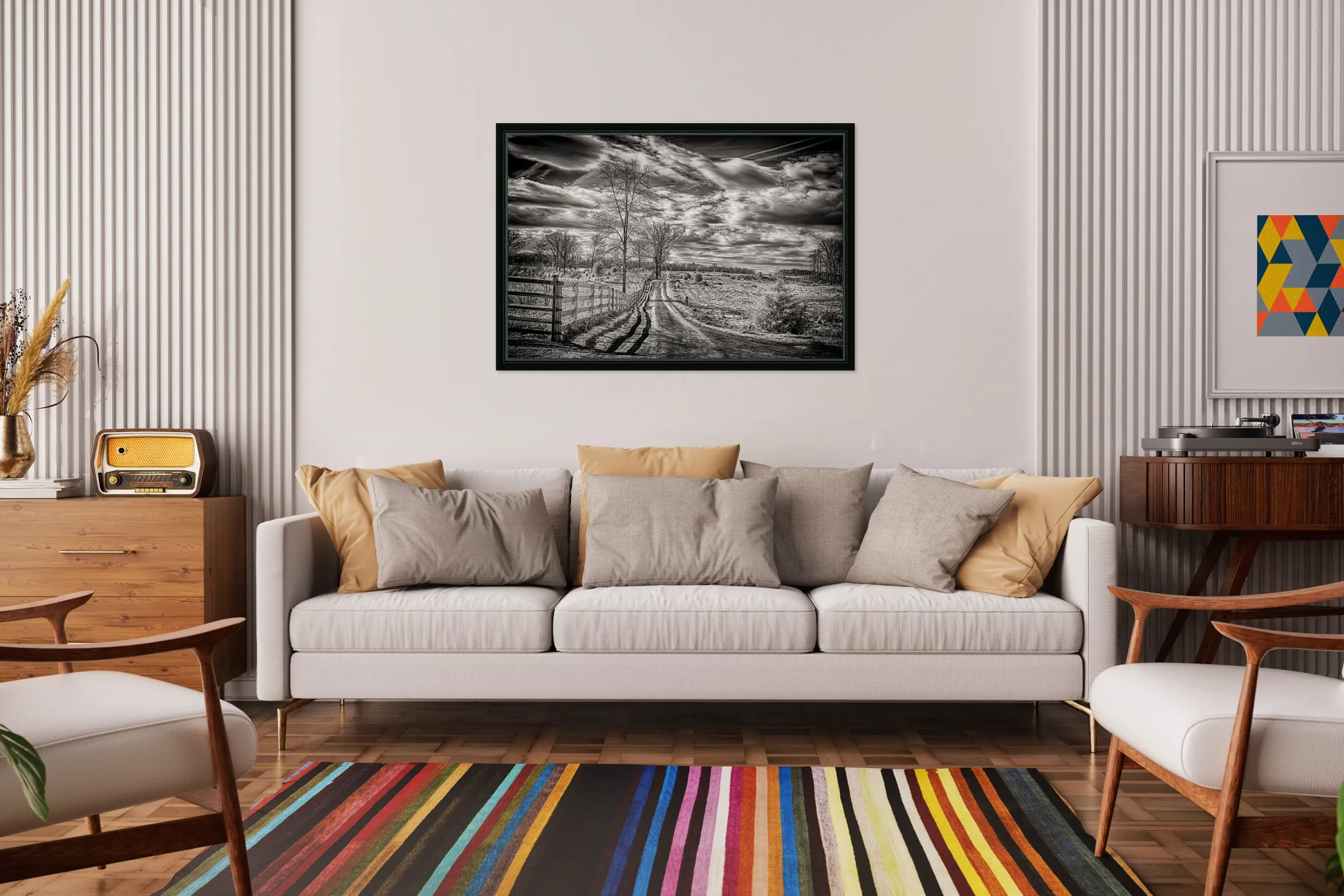 As I gazed upon the mesmerizing image captured in the heart of Gettysburg, I felt as if I had stepped into a scene straight out of The Wizard of Oz. The black and white photograph, aptly titled "Oz," depicted a dramatic rural landscape that seemed to pulsate with enchantment and intrigue. At the center of the composition, a curved dirt road wound its way through the rugged terrain, inviting me to embark on a journey of discovery. Flanked by a wooden fence, the road cast parallel, striated shadows that danced across its surface, adding to the surreal atmosphere of the scene. Lifeless trees stood as stoic sentinels scattered across the landscape like guardians of some ancient secret. Some were detailed and close by, while others formed a leafless horizon line in the distance, blending seamlessly with the moody sky above. The sky was expansive and dynamic, filled with a mix of billowing and wispy clouds that stretched and streamed across the frame, echoing the intensity and movement suggested by the rugged terrain below. The play of light and textures throughout the scene added depth and mystery to the image, evoking a sense of familiarity and otherworldliness. As I immersed myself in the mysteries of "Oz," I couldn't help but let my imagination soar. It was a moment of enchantment and wonder, where the boundaries between reality and fantasy blurred, and anything seemed possible.