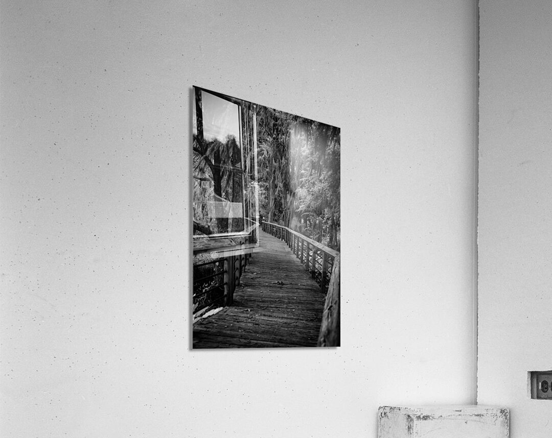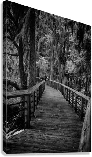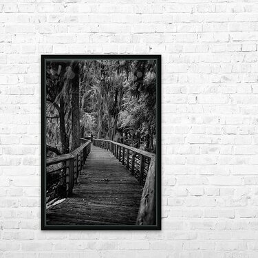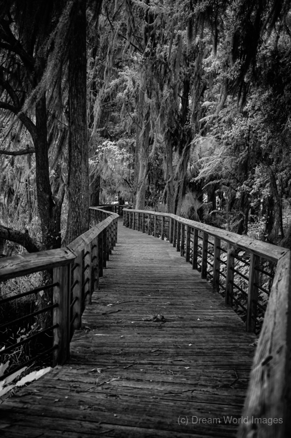 Deep in Florida's hidden corners, where Spanish moss weaves ancient spells and cypress trees guard timeless secrets, I discovered this ethereal pathway. Through monochromatic vision, the familiar boardwalk transformed into something far more mystical - a bridge between worlds, where reality blends with dreams. The moss-draped sentinels stand like silent watchers, their silver-gray beards catching whispers of stories that drift through this sacred space. Each weathered plank of the boardwalk tells its own tale, leading visitors deeper into nature's sanctuary where the veil between worlds grows thin. The curved path ahead doesn't just lead through a forest - it beckons us into the realm where everyday magic dwells. Some say these old Florida forests hold memories of times when shamans walked these lands, when every tree was known by name, and paths like these were gateways to understanding. On this quiet morning, as filtered light painted shadows across the wooden way, I felt that ancient energy still pulsing through every moss-draped branch and weathered board. This isn't just a trail through a forest - it's a journey through time itself, where each step might lead you closer to nature's oldest secrets.