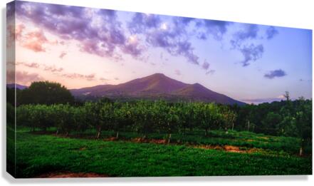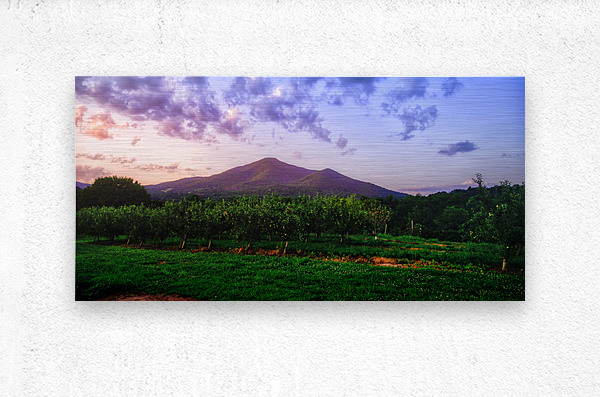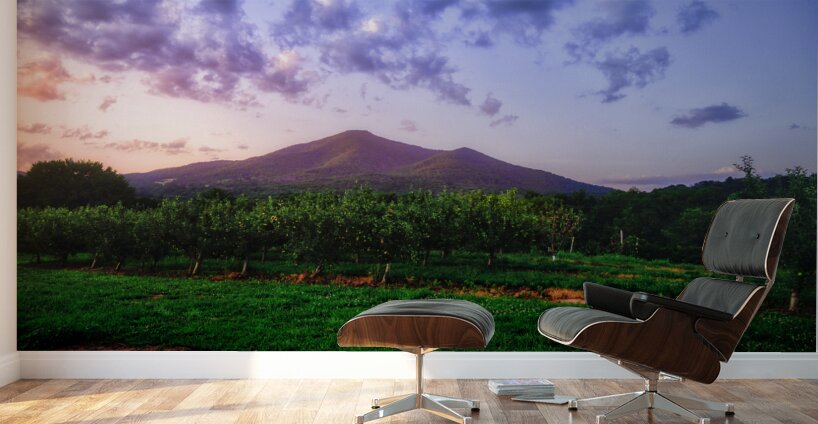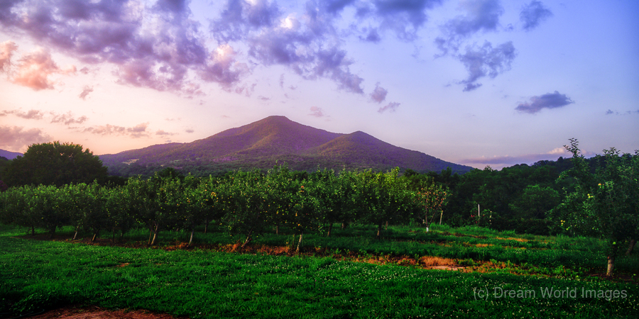Sun setting on an orchard under small hills in Virginia.