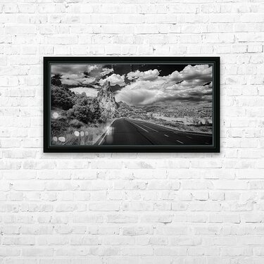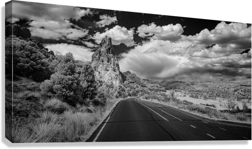 As I wandered through the enchanting landscapes of Garden of the Gods in Colorado Springs an unexpected spectacle unfolded before me. Cresting a small hill I was met with a captivating scene: a winding road leading toward the iconic rock peak that defines the majesty of the garden. The road gracefully turned to the right as it approached the towering formation. Capturing this scenic marvel in a black and white infrared image the photograph beckons viewers to embark on a visual journey titled Roadside Symphony at Garden of the Gods. The road serves as a metaphorical pathway guiding the eye toward the monumental rock peak that stands as the heart of this natural wonder. Adding a touch of drama to the composition a spring storm looms in the distance creating a dynamic contrast against the serene beauty of the garden. The play of light and shadows enhanced by the infrared treatment transforms the scene into a symphony of natures elements. Roadside Symphony at Garden of the Gods invites you to immerse yourself in the harmony of the landscape where the road becomes a narrative thread connecting the observer to the grandeur of the rock peak and the impending storm beyond. Join me on this visual odyssey through one of natures most captivating wonders.